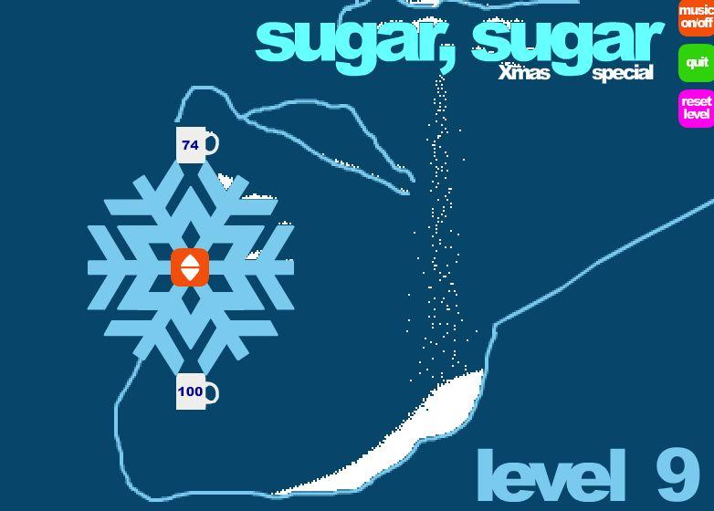Cukrus, cukrus, kalėdinė versija. Tai yra lengvas ir raminantis žaidimas. Čia iš viršaus krenta cukrus. Tau reikia nupaišyti linijas, kad cukrus sukristų į puodelius.