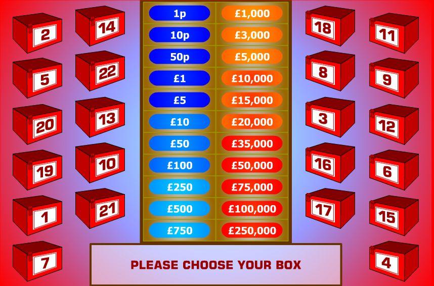 Tau reikia pasirinkti vieną dėžę, kurioje manai, kad yra didžiausia suma. O tada traukti dėžes, kur manai mažiausios sumos pinigų.